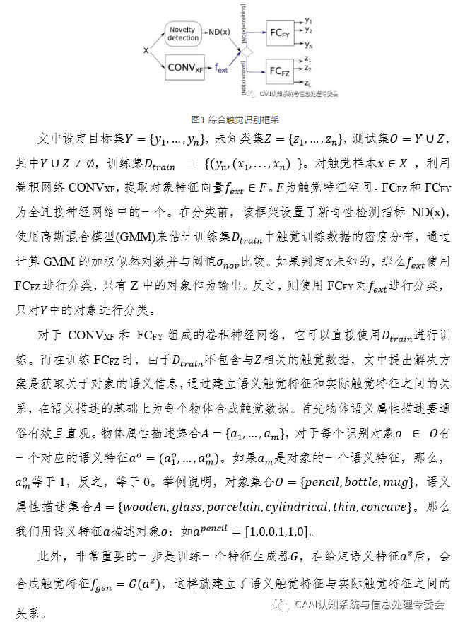 機(jī)器人通過(guò)收集大量觸覺(jué)數(shù)據(jù)來(lái)識(shí)別物體的方法存在一定的限制。一方面機(jī)器人觸覺(jué)傳感器收集大量物體的觸覺(jué)數(shù)據(jù)過(guò)程資源耗費(fèi)大,另一方面日常生活能接觸到的物體種類龐大。近期在IEEE TRANSACTIONS ON INDUSTRIAL INFORMATICS發(fā)表的一篇《A Deep Learning Framework forTactile Recognition of Known as Well as Novel Objects》文章中提出了一種基于卷積神經(jīng)網(wǎng)絡(luò)的綜合觸覺(jué)識(shí)別框架,它可以利用對(duì)象的語(yǔ)義屬性描述和觸覺(jué)數(shù)據(jù)的融合來(lái)實(shí)現(xiàn)對(duì)新對(duì)象的識(shí)別。相對(duì)于傳統(tǒng)學(xué)習(xí)方法有較大優(yōu)勢(shì),因?yàn)檎Z(yǔ)義信息更容易獲得,可以由人工[1]提供,也可以從語(yǔ)義數(shù)據(jù)庫(kù)(如Wikipedia[2])自動(dòng)挖掘。