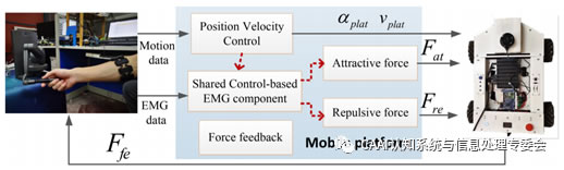 除了使用遙操作技術(shù)對機(jī)械臂或者機(jī)器手的控制,2020年西英格蘭大學(xué)的楊辰光團(tuán)隊提出了一種用于全向移動機(jī)器人的EMG與觸覺設(shè)備混合控制方法[8]。這種混合共享控制方法基于肌電圖和人工勢場,用以根據(jù)排斥力和吸引力避開障礙物,并基于移動平臺的力反饋增強(qiáng)人類對遠(yuǎn)程環(huán)境的感知。這種共享控制方法使遙操作者遠(yuǎn)程控制移動機(jī)器人的運(yùn)動并同步實現(xiàn)避障。與傳統(tǒng)的共享控制方法相比,該提議的方法提供了基于肌肉激活的力反饋,并驅(qū)動操作者以可預(yù)測的方式更新其控制意圖。終通過各種避障實驗表明這種遙控方法對移動機(jī)器人控制的有效性。