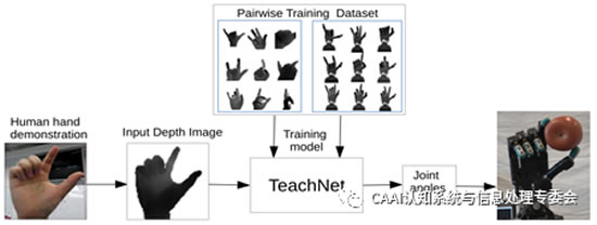 2019年,德國漢堡大學(xué)張建偉課題組和清華大學(xué)孫富春課題組共同提出TeachNet,一個直接從人類手指深度圖獲取機(jī)器人關(guān)節(jié)角度的深度學(xué)習(xí)網(wǎng)絡(luò)[10]。這種方法只需使用一個深度相機(jī),并實現(xiàn)端到端地控制機(jī)器人,是非常直觀和用戶友好的遙操作方法。TeachNet結(jié)合了一個一致性損失函數(shù)consistency loss,可以處理人手和機(jī)器手的外觀和內(nèi)在結(jié)構(gòu)差異。這個網(wǎng)絡(luò)的訓(xùn)練依賴于一個合成的400K人手-機(jī)器手?jǐn)?shù)據(jù)集,其中人手?jǐn)?shù)據(jù)來自于人手位姿深度圖像數(shù)據(jù)集BigHand2.0,然后在Gazebo中采集對應(yīng)每個人手的的機(jī)器手深度圖像。后,作者在5個不同操作者的抓取實驗中證明了TeachNet的穩(wěn)定性和G效率。但是這種方法僅限于機(jī)器手的控制,無法移動機(jī)械手使之在可達(dá)工作空間內(nèi)進(jìn)行抓取。