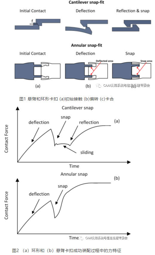 零件在不同的裝配階段產(chǎn)生的作用力可用于描述過(guò)程狀態(tài)。圖2所示的兩種卡扣的力特征圖具有不同的形狀,可用于及時(shí)識(shí)別裝配過(guò)程的完成情況。在這兩種情況下,物體的偏轉(zhuǎn)都會(huì)產(chǎn)生一個(gè)恒定的力,一旦部件的力消失,力就會(huì)急劇下降,當(dāng)兩部分鎖定在一起時(shí),力就會(huì)增大。懸臂卡扣在鎖定之前,兩個(gè)部件相互滑動(dòng),產(chǎn)生一個(gè)恒定的摩擦力,該摩擦力由于部件的材質(zhì)屬性造成的力載荷不同而變化。環(huán)形卡扣則不存在滑動(dòng)。力信號(hào)的確切形狀取決于連接部件的機(jī)械性能和卡扣類(lèi)型。環(huán)形和懸臂是兩個(gè)J端情況,環(huán)形卡扣是在恒定的力載荷下,而懸臂卡扣在咬合后載荷消失。