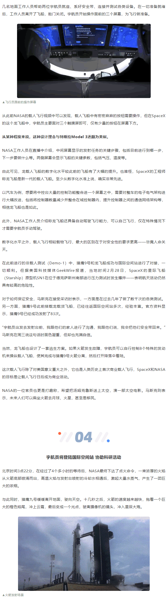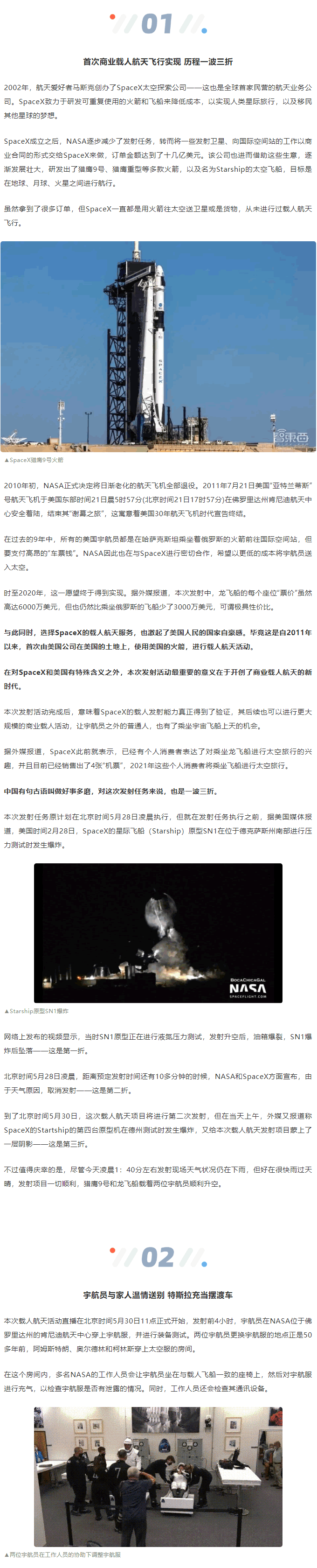 對SpaceX來說,這是其成立近20年來首次執(zhí)行航天產業(yè)中艱巨、技術難度G的載人航天任務,意味著其航天技術實現(xiàn)了新的突破,發(fā)展到了一個新的階段,受到了NASA乃至美國官方的完全認可。