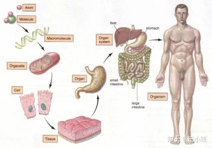 通過上一節(jié)的介紹我們也了解到,深度學(xué)習(xí)的黑箱性主要來源于其G度非線性性質(zhì),每個神經(jīng)元都是由上一層的線性組合再加上一個非線性函數(shù)的得到,我們無法像理解線性回歸的參數(shù)那樣通過非常solid的統(tǒng)計學(xué)基礎(chǔ)假設(shè)來理解神經(jīng)網(wǎng)絡(luò)中的參數(shù)含義及其重要程度、波動范圍。但實際上我們是知道這些參數(shù)的具體值以及整個訓(xùn)練過程的,所以神經(jīng)網(wǎng)絡(luò)模型本身其實并不是一個黑箱,其黑箱性在于我們沒辦法用人類可以理解的方式理解模型的具體含義和行為,而神經(jīng)網(wǎng)絡(luò)的一個非常好的性質(zhì)在于神經(jīng)元的分層組合形式,這讓我們可以用物質(zhì)組成的視角來理解神經(jīng)網(wǎng)絡(luò)的運作方式。比如如下圖所示,人體的組成過程是從分子-細胞-組織-器官-系統(tǒng)-人體: