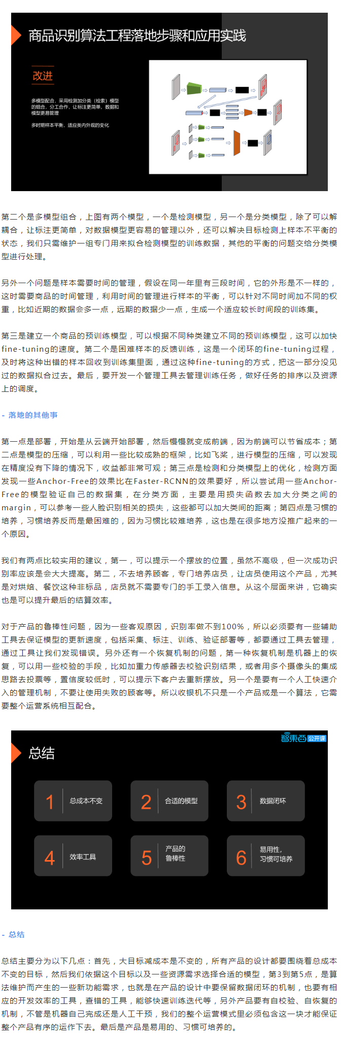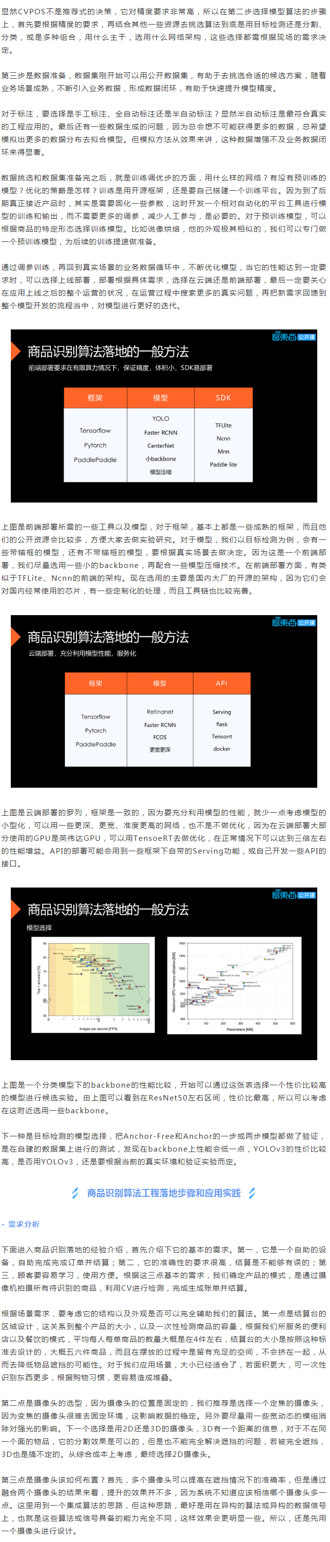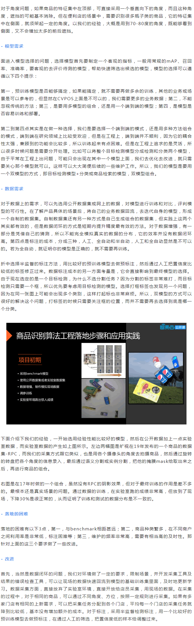 我們講到的自助收銀設備叫做CVPOS,從名稱看出它是借助視覺的技術的POS機。首先從它的基本的需求開始介紹,作為一個自助設備,它的基本功能是要自己操作,輸出訂單并完成結算,而不需要其他人員參與,這是產(chǎn)品D層的需求。再往下探一些需求,相比于掃碼支付而言,怎樣提升體驗呢?它可以一次識別多個,并且解決掃碼不能解決的非標品問題。根據(jù)這兩級的需求,產(chǎn)品的模式是嘗試用攝像機拍攝結算臺上的所有的商品,用視覺模型進行識別。當然也可以用別的傳感器,但是視覺是準確的。如果大家了解這個行業(yè),可能會出現(xiàn)用重力傳感器去識別,但是它的限制會G很多。