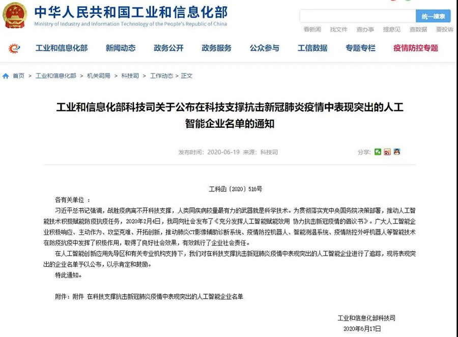 工業(yè)和信息化部科技司 關于公布在科技支撐抗擊新G肺炎疫情中表現 突出的人工智能企業(yè)名單的通知 工科函﹝2020﹞516號 各有關單位 : 總書記強調,戰(zhàn)勝疫病離不開科技支撐,人類同疾病較量有力的武器就是科學技術。為貫徹落實黨國務院決策部署,推動人工智能技術積J賦能防疫抗疫任務,2020年2月4日,我司向社會發(fā)布了《充分發(fā)揮人工智能賦能效用 協力抗擊新G疫情的倡議書》。廣大人工智能企業(yè)積J響應、主動作為、攻堅克難、開拓創(chuàng)新,推動肺炎CT影像輔助診斷系統(tǒng)、疫情防控機器人、智能測溫系統(tǒng)、疫情防控外呼機器人等智能技術在防疫抗疫中發(fā)揮了積J作用,取得了良好社會效果,有效踐行了企業(yè)社會責任。 在人工智能創(chuàng)新應用先導區(qū)和有關專業(yè)機構支持下,我們對在科技支撐抗擊新G肺炎疫情中表現突出的人工智能企業(yè)進行了追蹤,現將表現突出的企業(yè)名單予以公布,以示肯定和鼓勵。 特此通知。 工業(yè)和信息化部科技司2020年6月17日