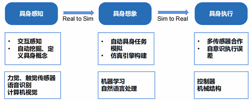 3 具身執(zhí)行(Execution):基于計(jì)算機(jī)視覺(jué)、機(jī)器人學(xué)和計(jì)算機(jī)圖形學(xué),通過(guò)多模型訓(xùn)練,在多傳感器合作下完成任務(wù)執(zhí)行。