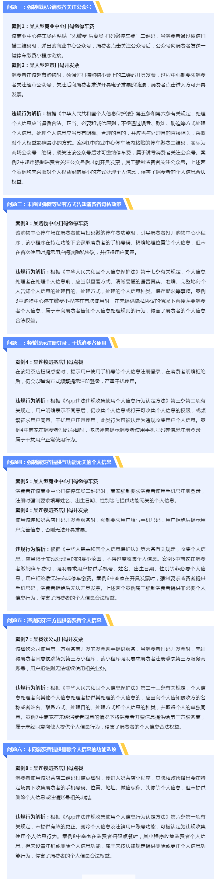 為進(jìn)一步規(guī)范我市掃碼消費(fèi)服務(wù)經(jīng)營行為,切實(shí)保護(hù)消費(fèi)者個(gè)人信息合法權(quán)益,綜合對(duì)我市提供掃碼消費(fèi)服務(wù)二維碼抽樣測(cè)試情況,對(duì)六類常見易發(fā)違規(guī)問題進(jìn)行案例解析,根據(jù)《中華人民共和國個(gè)人信息保護(hù)法》《App違法違規(guī)收集使用個(gè)人信息行為認(rèn)定方法》等法律法規(guī),提出六條合規(guī)指引,供全市提供掃碼消費(fèi)服務(wù)的經(jīng)營者遵照?qǐng)?zhí)行。