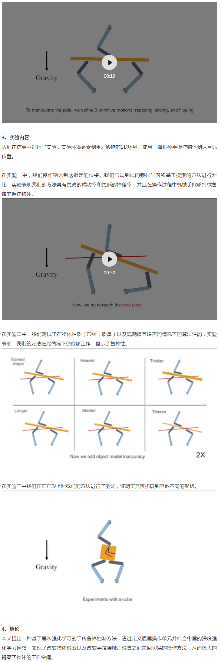 傳統(tǒng)上,手內(nèi)操作有兩類解決方案,一類是基于模型的方法(model-based method),通過對(duì)抓取的動(dòng)力學(xué)建模,來控制手指移動(dòng)帶動(dòng)物體姿態(tài)。這種辦法好處在于穩(wěn)定性強(qiáng),模型簡單,但問題在于難以實(shí)現(xiàn)較長和復(fù)雜的手內(nèi)操作流程,特別是目標(biāo)位姿和起始位姿相距很遠(yuǎn)的情況,因?yàn)樗鼈兒茈y規(guī)劃手指接觸點(diǎn)的移動(dòng);另一類方法是無模型方法(model-free method),通常使用深度強(qiáng)化學(xué)習(xí)的方法。這類方法優(yōu)點(diǎn)在于不需要系統(tǒng)模型,但缺點(diǎn)在于穩(wěn)定性差,并且需要大量數(shù)據(jù)進(jìn)行訓(xùn)練。而我們的方法結(jié)合了這兩種方法:在底層使用傳統(tǒng)的動(dòng)力學(xué)建模方式保持穩(wěn)定的抓取和實(shí)現(xiàn)簡單基本的操作單元,在中層通過深度強(qiáng)化學(xué)習(xí)來進(jìn)行規(guī)劃,選擇不同的操作單元,終實(shí)現(xiàn)穩(wěn)定且復(fù)雜的操作流程。我們的方法結(jié)合了兩種方法的優(yōu)點(diǎn):在底層通過使用基于模型的操作單元,保證了手指與物體之間持續(xù)穩(wěn)定的抓;在中層使用強(qiáng)化學(xué)習(xí)進(jìn)行規(guī)劃,從而實(shí)現(xiàn)較長和復(fù)雜的手內(nèi)操作流程。