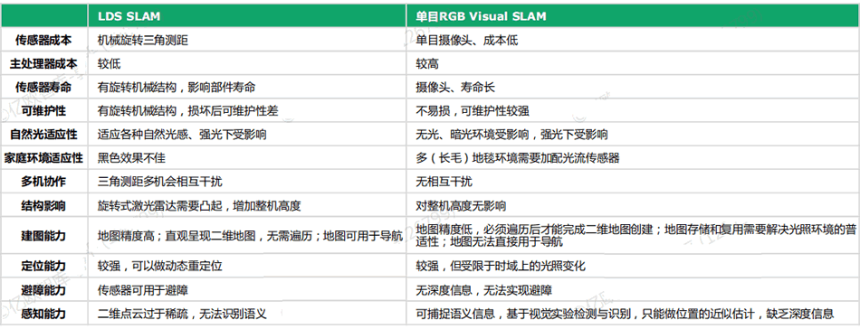 LDS SLAM 與 VSLAM 各有優(yōu)劣,二者相容或成為行業(yè)主流發(fā)展方向之一。對(duì)比 LDS SLAM 技術(shù)與單目 VSLAM 技術(shù),其中 LDS SLAM 技術(shù)可視范圍廣(VSLAM 只有50-60度),環(huán)境適應(yīng)性更強(qiáng),地圖精度更G,同時(shí)能夠獲取深度信息,可以應(yīng)用于避障;而VSLAM技術(shù)成本更低,攝像頭的壽命長、不易損、不增加機(jī)身G度,同時(shí)能夠捕捉語義信息,提升地圖分區(qū)精度。