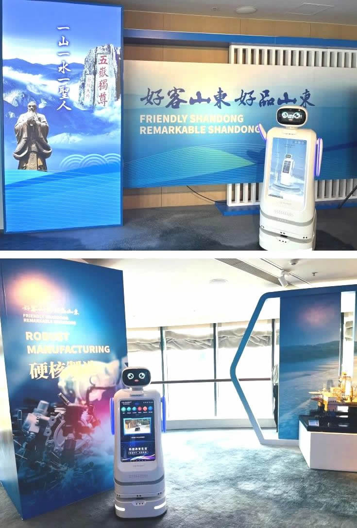 5月27日下午,在“好客山東 好品山東”展區(qū),類人型智能服務(wù)機(jī)器人“創(chuàng)創(chuàng)”作為主題墻1號(hào)展品熱情迎接了全國(guó)政協(xié)副主席梁振英、省委書記林武等與會(huì)L導(dǎo)和嘉賓。