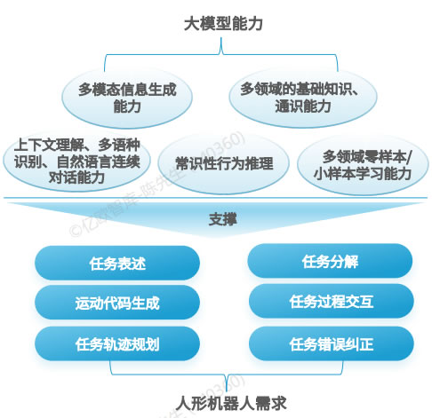 人形機器人在商業(yè)化進程中面臨著復雜任務執(zhí)行難度大,交互能力不足、研發(fā)成本G、場景覆蓋低等問題。隨著Al大模型技術不斷發(fā)展,大模型可加快人形機器人復雜任務訓練速度,提升任務生成速度及縮短理解周期, 促使人形機器人在語言處理、場景理解、運動控制等方面加速突破,執(zhí) 行更多復雜任務場景,加速其通用化和智能化進程。
