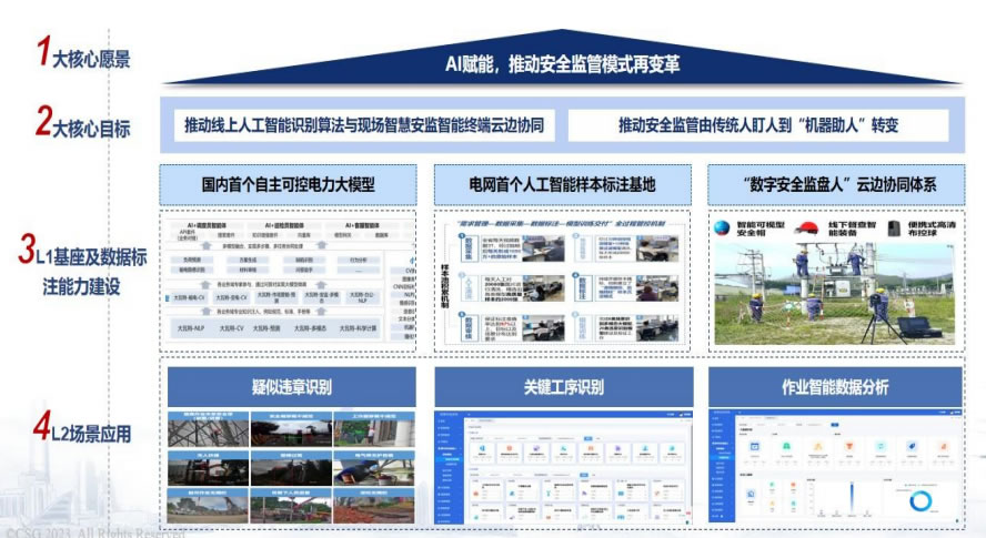 基于公司大瓦特生態(tài)技術(shù)體系,推動(dòng)安全監(jiān)管模式再變革 1 大核心愿景,細(xì)化 2 大核心目標(biāo),依托大瓦特 L0 電力基礎(chǔ)大模型、電網(wǎng)人工智能樣本標(biāo)注基地、“數(shù)字安全監(jiān)盤(pán)人”功能L先為 3 大核心基礎(chǔ),構(gòu)建疑 似違章識(shí)別、關(guān)鍵工序識(shí)別、作業(yè)智能數(shù)據(jù)分析等 3 大核心功能的人工智能推動(dòng)安監(jiān)模式變革建設(shè)“1234”總體框架。