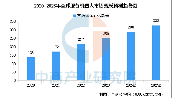隨著人口老齡化的加劇,老年人對醫(yī)療、康復(fù)、陪伴等服務(wù)的需求日益增加,為服務(wù)機(jī)器人提供了廣闊的市場空間。2023年服務(wù)機(jī)器人市場規(guī)模達(dá)到約250億美元,比上年增長15.21%。中商產(chǎn)業(yè)研究院分析師預(yù)測,2024年服務(wù)機(jī)器人市場規(guī)模將達(dá)到290億美元,2025年達(dá)到328億美元。