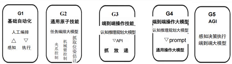 同時,智元還定義了G1 至 G5 的具身智能技術(shù)演進路線。G1 主要針對特定場景;G2 面向更多場景任務(wù), 具有一定的泛化能力;G3 從原先的算法驅(qū)動轉(zhuǎn)變?yōu)閿?shù)據(jù)驅(qū)動;G4 引入了仿真數(shù)據(jù)和世界模型;G5 致力于 從感知到執(zhí)行,具備G度的自主性和適應(yīng)性。目前智元處于G2和G3階段,已在G2路線取得階段性突破, 實現(xiàn)了UniPose、UniGrasp、UniPlug 的通用原子模型,G3 路線上也形成了全流程具身數(shù)據(jù)方案AIDEA。