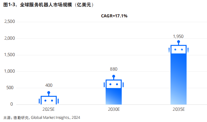 研究表明 ,服務(wù)機(jī)器人產(chǎn)業(yè)蓬勃發(fā)展 ,產(chǎn) 業(yè)規(guī)模持續(xù)增長(zhǎng)。據(jù)研究數(shù)據(jù)顯示 ,服務(wù)機(jī)器人行業(yè)已進(jìn)入快速發(fā)展期 ,市場(chǎng)規(guī)模增長(zhǎng)強(qiáng)勁。2025年,服務(wù)機(jī)器人(全產(chǎn)業(yè)鏈)市場(chǎng)規(guī)模預(yù)計(jì)達(dá)到400億美元。未來(lái)十年將以17.1% 的復(fù)合年增長(zhǎng)率增長(zhǎng),到2035年,服務(wù)機(jī) 器人市場(chǎng)規(guī)模有望達(dá)到1,950億美元 ,市場(chǎng)潛 力巨大。