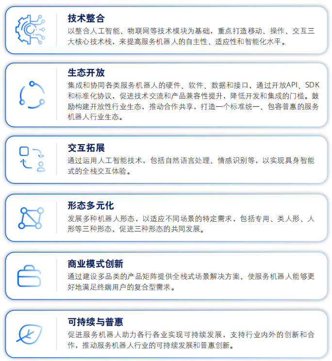 開放性的全棧式智能服務機器人生態(tài)即是這樣 一幅藍圖。在該生態(tài)中 ,多元形態(tài)、多品類產(chǎn) 品矩陣、多技術棧等共同構成了發(fā)展具身智能 的堅實基礎 ,在技術的創(chuàng)新、硬件的多元化、 行業(yè)標準規(guī)范的建立等多重驅(qū)動下 ,具身智能 賦予機器人適應不同環(huán)境、處理多樣化任務的 能力 ,使其能夠在多種場景中自如運作 ,從而 帶來服務模式的多面革新。