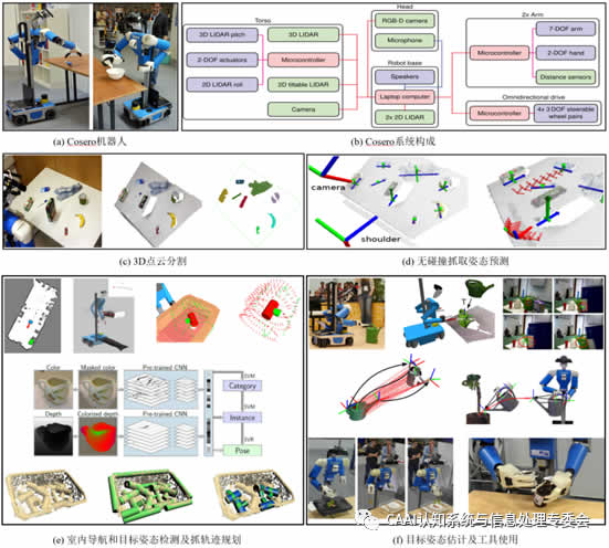 Cosero[1]是德國波恩大學(xué)的Sven Behnke團(tuán)隊(duì)根據(jù)家庭環(huán)境中的日常操作任務(wù)而研制的一款仿人操作機(jī)器人(如圖1(a)(b))。機(jī)器人底部配備了四輪獨(dú)立轉(zhuǎn)向行走機(jī)構(gòu),以便在靈活的通過狹窄通道,上部配備了兩個7自由度機(jī)械臂已完成擬人的操作,并在夾持器末端裝有紅外測距傳感器已達(dá)到對抓取目標(biāo)的距離探測,在D端安裝有Kinect相機(jī),以實(shí)現(xiàn)對目標(biāo)環(huán)境的3D感知。Cosero通過底盤的激光雷達(dá)進(jìn)行導(dǎo)航和定位,采用法線估計(jì)和場景分割相結(jié)合的方法對目標(biāo)進(jìn)行3D點(diǎn)云分割,采用無碰撞抓取方法[1]對目標(biāo)物體進(jìn)行抓取(如圖1(c)(d))。在論文[2]中,作者運(yùn)用Cosero進(jìn)行零件分揀搬運(yùn)實(shí)驗(yàn),通過2D激光雷達(dá)導(dǎo)航到作業(yè)點(diǎn),通過RGB-D相機(jī)對目標(biāo)進(jìn)行識別分割,規(guī)劃抓取路徑和抓取姿態(tài)估計(jì)(如圖1(e))。在論文[3]中,作者采用深度學(xué)習(xí)方法對目標(biāo)進(jìn)行姿態(tài)估計(jì),并完成了提壺灌溉,人機(jī)交互和使用工具等復(fù)雜任務(wù)(如圖1(f))。Schwarz[4]介紹了Cosero基于深度學(xué)習(xí)方法的目標(biāo)姿態(tài)估計(jì)和RGB-D SLAM等感知測量。