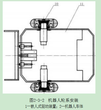 在該裝置中選用帶調(diào)速功能的直流電機(jī)作為動(dòng)力,電機(jī)轉(zhuǎn)動(dòng)時(shí)由電機(jī)軸直接 帶動(dòng),電機(jī)驅(qū)動(dòng)法蘭盤與車輪緊固連接,繼而驅(qū)動(dòng)車輪,實(shí)現(xiàn)直接驅(qū)動(dòng),車輪與電機(jī) 之間同步旋轉(zhuǎn),無任何變速環(huán)節(jié)和嚙合環(huán)節(jié),避免了累計(jì)回轉(zhuǎn)誤差和可能的打滑。 機(jī)器人車體上安裝左右兩個(gè)驅(qū)動(dòng)裝置,通過對(duì)電機(jī)轉(zhuǎn)速的調(diào)節(jié)來控制車輪轉(zhuǎn)速和 回轉(zhuǎn)方向的變化,使機(jī)器人實(shí)現(xiàn)雙輪差動(dòng)運(yùn)動(dòng),走直線、圓弧甚至更復(fù)雜的運(yùn)動(dòng)。 橡膠車輪與電機(jī)安裝套間采用一對(duì)推力球軸承作為回轉(zhuǎn)副,軸承與電機(jī)安裝套。 外圈與橡膠車輪均為緊配合,兩軸承間以止推環(huán)和擋圈保持間距,軸承與電機(jī)安裝 套間通過軸承止推法蘭盤和電機(jī)安裝套的凸臺(tái)限位,保證整體機(jī)構(gòu)的穩(wěn)定和配合的緊密。整套裝置中,電機(jī)安裝套、電機(jī)驅(qū)動(dòng)法蘭盤、軸承止推法蘭盤以及相應(yīng)連 接件推力球軸承、止推環(huán)、擋圈全部嵌入橡膠車輪中,配合緊密,同時(shí)起到車輪軸的 作用. 由于該結(jié)構(gòu)短而粗,所以剛度強(qiáng)度相當(dāng)大,能夠承受很強(qiáng)的沖擊。并且選用 的驅(qū)動(dòng)電機(jī)嵌入電機(jī)安裝套,機(jī)器人對(duì)抗時(shí)車輪承受的沖擊由與車輪緊密配合的 電機(jī)安裝套等部件直接承受,避免了電機(jī)直接承受沖擊,起到緩沖作用。以上共同 構(gòu)成雙重嵌入式結(jié)構(gòu),結(jié)構(gòu)精簡(jiǎn)、體積小,穩(wěn)定性高和緊密度高。嵌入式直接驅(qū)動(dòng) 裝置如圖2-3-1所示,機(jī)器人輪系安裝如圖2-3-2所示。