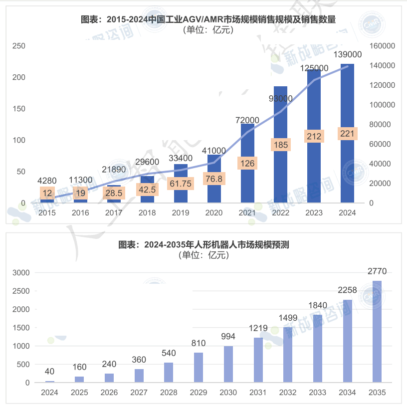 根據(jù)新戰(zhàn)略移動(dòng)機(jī)器人產(chǎn)業(yè)研究所統(tǒng)計(jì), 2024年ZG工業(yè)應(yīng)用移動(dòng)機(jī)器人銷售規(guī)模為221億, 同比增長(zhǎng)4.25%; 銷售數(shù)量為139000臺(tái), 同比增長(zhǎng)1 1.2% ZG市場(chǎng)人形機(jī)器人出貨量超2800臺(tái), 市場(chǎng)規(guī)模超20億; 清潔及環(huán)衛(wèi)機(jī)器人累計(jì)出貨超12900臺(tái) (不含小型家用墻面清潔泳池清潔機(jī)器人) , 市場(chǎng)銷售規(guī)模約 27.6億元。 2024年, ZG智能移動(dòng)機(jī)器人整體市場(chǎng)已突破300億元。