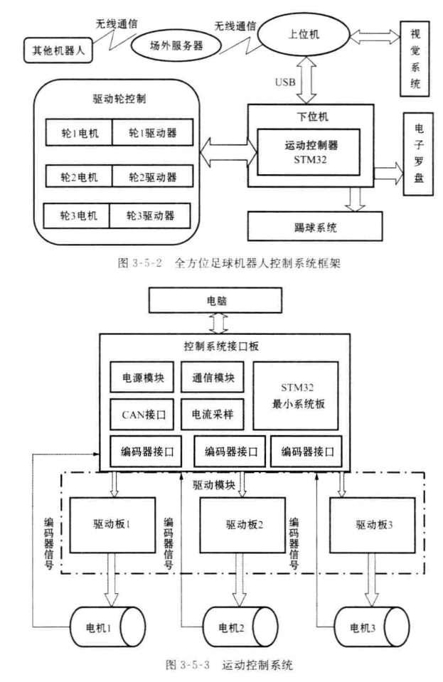 運(yùn)動(dòng)控制系統(tǒng)由通信模塊、電源模塊、控制模塊和電機(jī)驅(qū)動(dòng)模塊組成。一塊主 控制板(STM32) 控制3塊驅(qū)動(dòng)電路,分別驅(qū)動(dòng)3個(gè)全方位輪,實(shí)現(xiàn)3軸聯(lián)動(dòng)。當(dāng)機(jī)器人工作時(shí),通信模塊負(fù)責(zé)從PC 機(jī)接收指令數(shù)據(jù),包括3個(gè)輪子的速度和是否踢 球判斷以及踢球力度?刂颇K將3個(gè)輪子的速度發(fā)送到運(yùn)動(dòng)控制模塊,并產(chǎn)生 一個(gè)踢球信號(hào)控制氣動(dòng)踢球系統(tǒng)產(chǎn)生踢球動(dòng)作。運(yùn)動(dòng)控制模塊則控制著3個(gè)輪子 的速度,并且將通過閉環(huán)采集到的電機(jī)碼盤信息獲得的3個(gè)輪子的速度反饋回PC 機(jī),供機(jī)器人上層策略算法使用。其結(jié)構(gòu)圖如圖3-5-3。通信模塊和運(yùn)動(dòng)控制模塊的CPU采用的是 STM32F103CB。