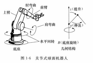 這種機(jī)器人主要由底座(或軀干)、上臂和前臂構(gòu)成。上臂和前臂可在通過底座的垂直平面上運(yùn)動(dòng),如圖1-6所示。在前臂和上臂間,機(jī)械手有個(gè)肘關(guān)節(jié);而在上臂和底座間, 有個(gè)肩關(guān)節(jié)。在水平平面上的旋轉(zhuǎn)運(yùn)動(dòng),既可 由肩關(guān)節(jié)進(jìn)行,也可以繞底座旋轉(zhuǎn)來實(shí)現(xiàn)。這 種機(jī)器人的工作包跡形成球面的大部分,稱為 關(guān)節(jié)式球面機(jī)器人。