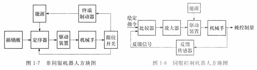 伺服控制機(jī)器人(servo-controlled robot)比非伺服機(jī)器人有更強(qiáng)的工作能力,因而價(jià)格較貴,但在某些情況下不如簡(jiǎn)單的機(jī)器人可靠。圖1-8表示伺服控制機(jī)器人的方塊圖。 伺服系統(tǒng)的被控制量(輸出)可為機(jī)器人端部執(zhí)行裝置(或工具)的位置、速度、加速度和力 等。通過(guò)反饋傳感器取得的反饋信號(hào)與來(lái)自給定裝置(如給定電位器)的綜合信號(hào),用比較器加以比較后,得到誤差信號(hào),經(jīng)過(guò)放大后用以激發(fā)機(jī)器人的驅(qū)動(dòng)裝置,進(jìn)而帶動(dòng)末端執(zhí) 行裝置以一定規(guī)律運(yùn)動(dòng),到達(dá)規(guī)定的位置或速度等。顯然,這就是一個(gè)反饋控制系統(tǒng)。