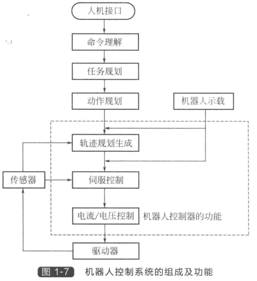 對(duì)于一個(gè)具有高度智能的機(jī)器人,它的控制系統(tǒng)實(shí)際上包含了“任務(wù)規(guī)劃” “動(dòng)作規(guī)劃”“軌跡規(guī)劃”和基于模型的 “伺服控制”等多個(gè)層次,如圖1-7所示。 機(jī)器人先要通過(guò)人機(jī)接口獲取操作者的 指令,指令的形式可以是人的自然語(yǔ)言, 或者是由人發(fā)出的專(zhuān)用的指令語(yǔ)言,也可 以是通過(guò)示教工具輸入的示教指令,或者 鍵盤(pán)輸入的機(jī)器人指令語(yǔ)言以及計(jì)算機(jī)程