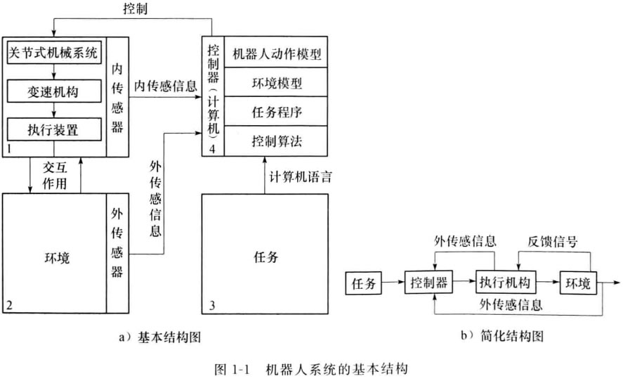 一 般情況下, 一 個(gè)機(jī)器人系統(tǒng)由下列四個(gè)互相作用的部分組成:機(jī)械手、環(huán)境、任務(wù) 和控制器,如圖1 - 1a 所示,圖1 - 16為其簡(jiǎn)化形式。