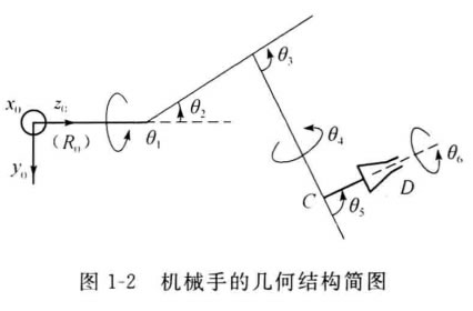 機(jī)械手是具有傳動(dòng)執(zhí)行裝置的機(jī)械,它由臂、關(guān)節(jié)和末端執(zhí)行裝置(工具等)構(gòu)成,組合為一個(gè)互相連接和互相依賴(lài)的運(yùn)動(dòng)機(jī)構(gòu)。機(jī) 械手用于執(zhí)行指定的作業(yè)任務(wù)。不同的機(jī)械手 具有不同的結(jié)構(gòu)類(lèi)型。圖1-2給出機(jī)械手的幾何 結(jié)構(gòu)簡(jiǎn)圖。機(jī)械手又稱(chēng)為操作機(jī)、機(jī)械臂或操 作手。大多數(shù)機(jī)械手是具有幾個(gè)自由度的關(guān)節(jié) 式機(jī)械結(jié)構(gòu), 一般具有六個(gè)自由度。其中,頭 三個(gè)自由度引導(dǎo)夾手裝置至所需位置,而后三 個(gè)自由度用來(lái)決定末端執(zhí)行裝置的方向。
