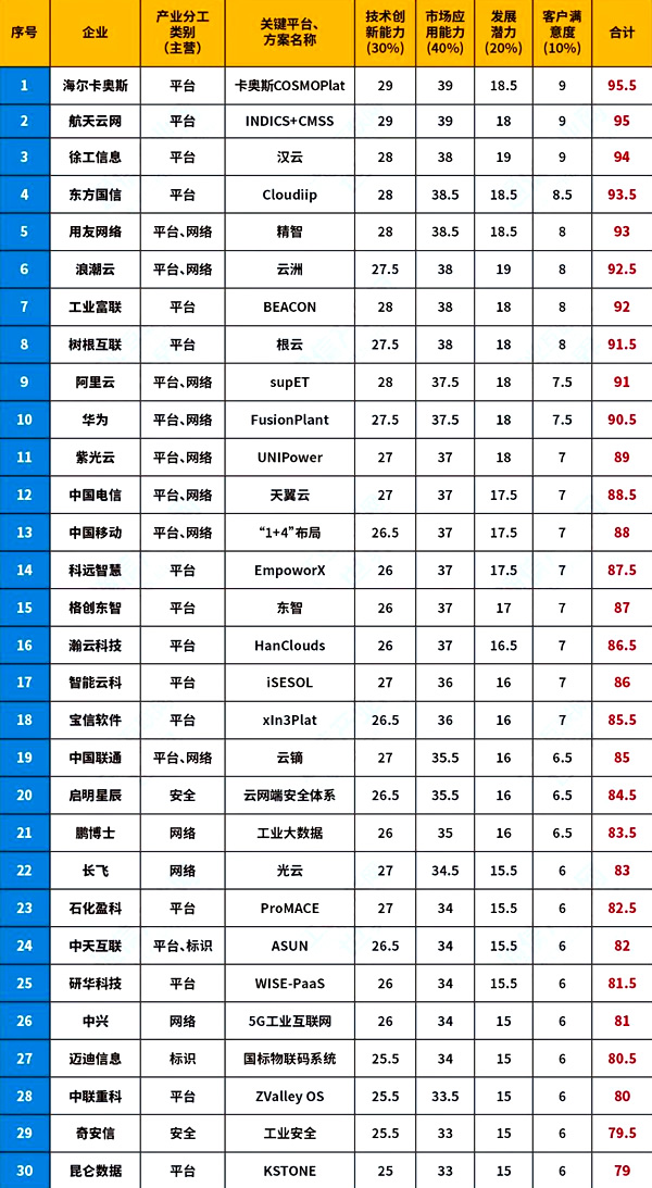 1 | 海爾卡奧斯 | 平臺 | 卡奧斯COSMOPlat | 29 | 39 | 18.5 | 9 | 95.5 |