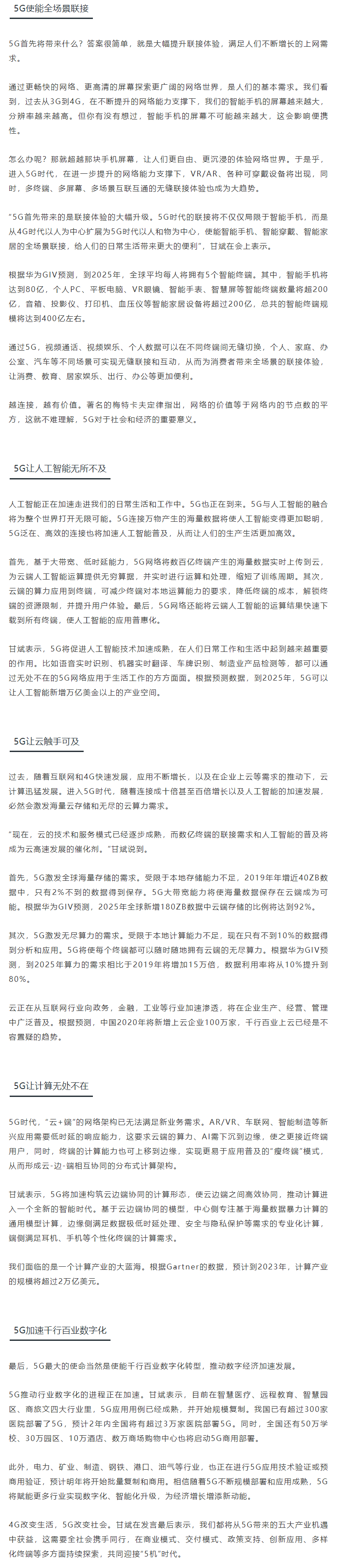 2020年6月30日,在GSMA舉辦的新基建與企業(yè)數(shù)字化論壇上,華為無線網(wǎng)絡(luò)S席營(yíng)銷官甘斌發(fā)表了《5G=5“機(jī)”,新價(jià)值,新機(jī)遇》的主題演講。會(huì)上,甘斌詮釋了5G將驅(qū)動(dòng)聯(lián)接、AI、云、計(jì)算、行業(yè)應(yīng)用五大產(chǎn)業(yè)升級(jí),為數(shù)字經(jīng)濟(jì)發(fā)展注入新動(dòng)能。