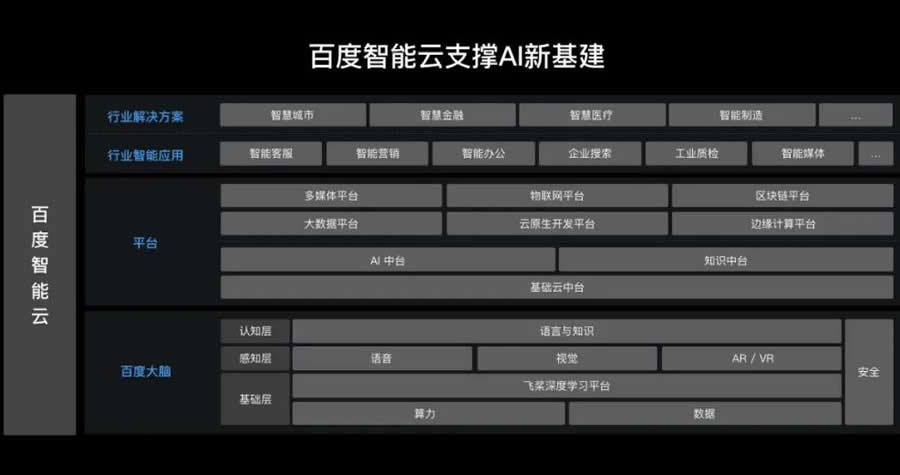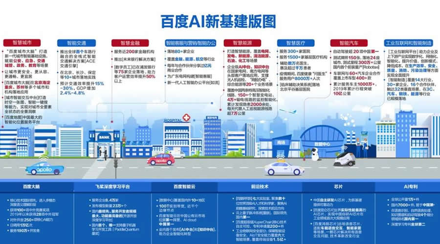 6月11日,百度發(fā)布AI新基建版圖,目標(biāo)成為中國(guó)新基建AI服務(wù)大提供商。依托百度大腦、飛槳深度學(xué)習(xí)平臺(tái)、百度智能云、芯片、量脈、超級(jí)鏈等在內(nèi)的新型AI基礎(chǔ)設(shè)施,百度在智慧城市、智能交通、智慧金融、智能客服與營(yíng)銷、智慧能源、智慧醫(yī)療、智能汽車、工業(yè)互聯(lián)網(wǎng)和智能制造等八大L域推動(dòng)產(chǎn)業(yè)智能化升級(jí)。