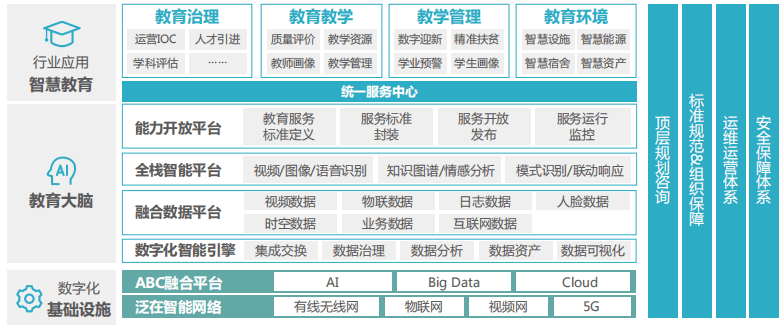 “2”指的是數(shù)字化基礎(chǔ)設(shè)施,包含校園的泛在智能網(wǎng)絡(luò)和ABC融合平臺(tái)。校園泛在智能網(wǎng)絡(luò)實(shí)現(xiàn)有線無(wú)線網(wǎng)、物聯(lián)