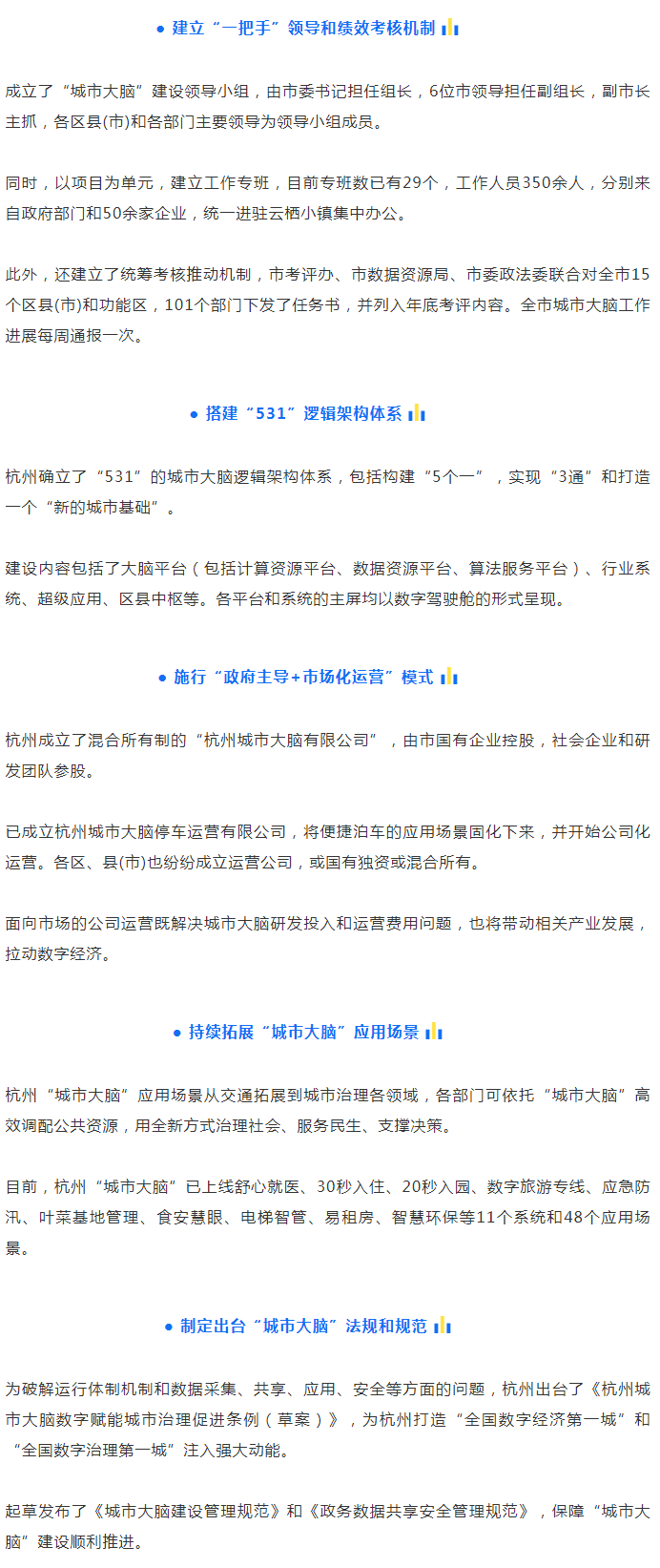 治堵取得階段性勝利后,2018年9月和12月,杭州市推出了“城市大腦升級(jí)”版,提出構(gòu)建 “以大腦中樞平臺(tái)為核心,縱向到區(qū)縣(市),橫向到各部門”的“城市大腦”,建立了市級(jí)、部門系統(tǒng)、區(qū)縣平臺(tái)和街道平臺(tái)四類數(shù)字駕駛艙,并聚焦城市治理的“痛點(diǎn)”“堵點(diǎn)”和群眾反映強(qiáng)烈的“熱點(diǎn)”“難點(diǎn)”問(wèn)題,推出了11大系統(tǒng)和48個(gè)應(yīng)用場(chǎng)景,“城市大腦”在城市運(yùn)行的生命體征感知、公共資源配置、宏觀決策指揮、事件預(yù)測(cè)預(yù)警、“城市病”治理等方面發(fā)揮了重要作用。