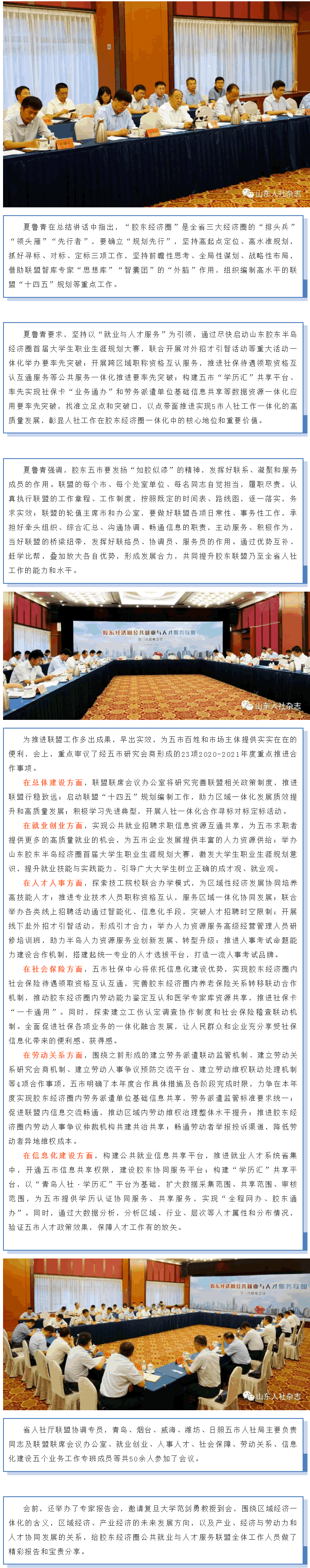 青島市人民政府秘書長孫繼出席會議并致辭。聯(lián)盟聯(lián)席會議主席,省人力資源社會保障廳黨組副書記、副廳長、一級巡視員夏魯青作總結(jié)講話。聯(lián)盟D一任輪值執(zhí)行主席、秘書長,青島市委組織部副部長、市人力資源和社會保障局黨組書記、局長胡義瑛主持會議。