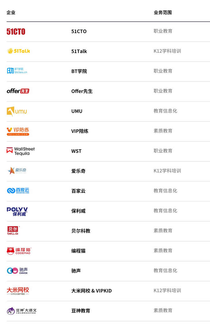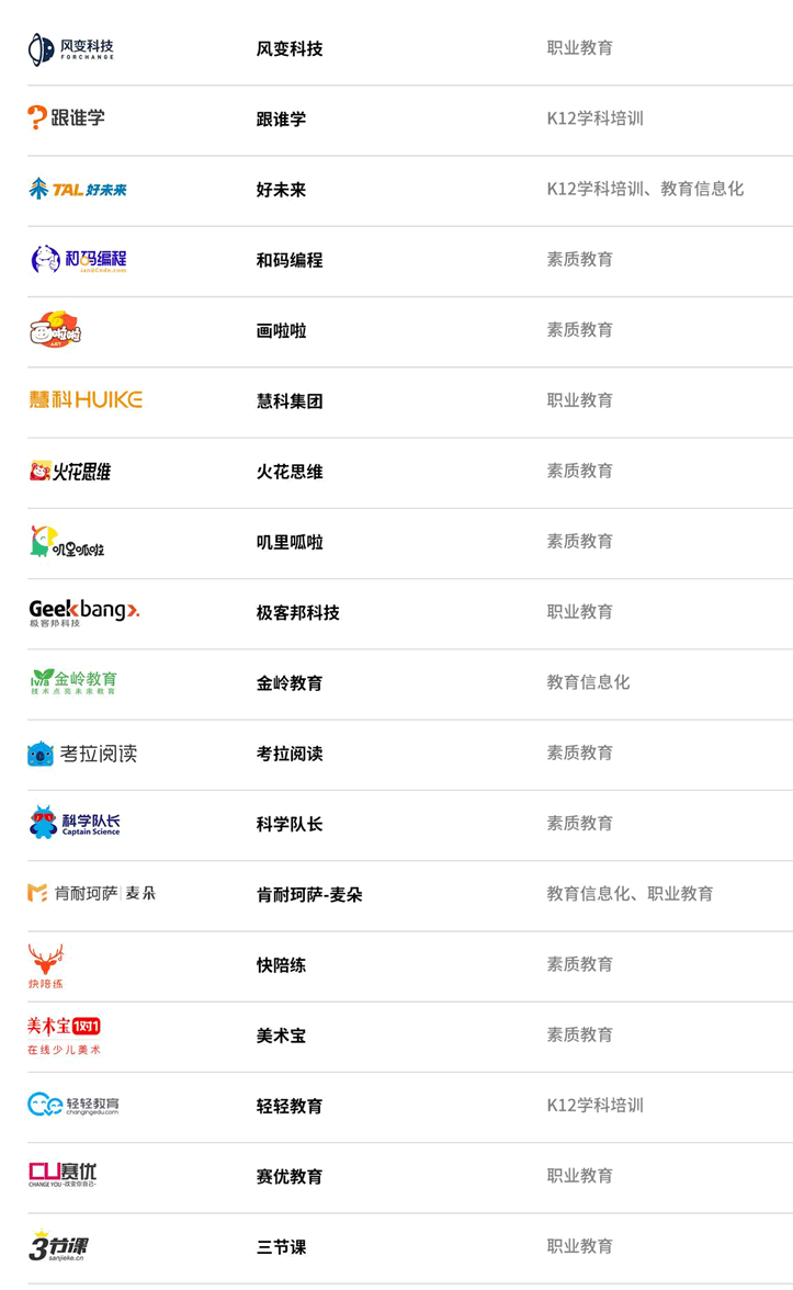 掌門教育、好未來,新東方在線、說客英語、猿輔導(dǎo)、跟誰學(xué),有道,大米網(wǎng)校,作業(yè)幫,輕輕教育,51talk,愛樂奇,悉之教育,卓世未來