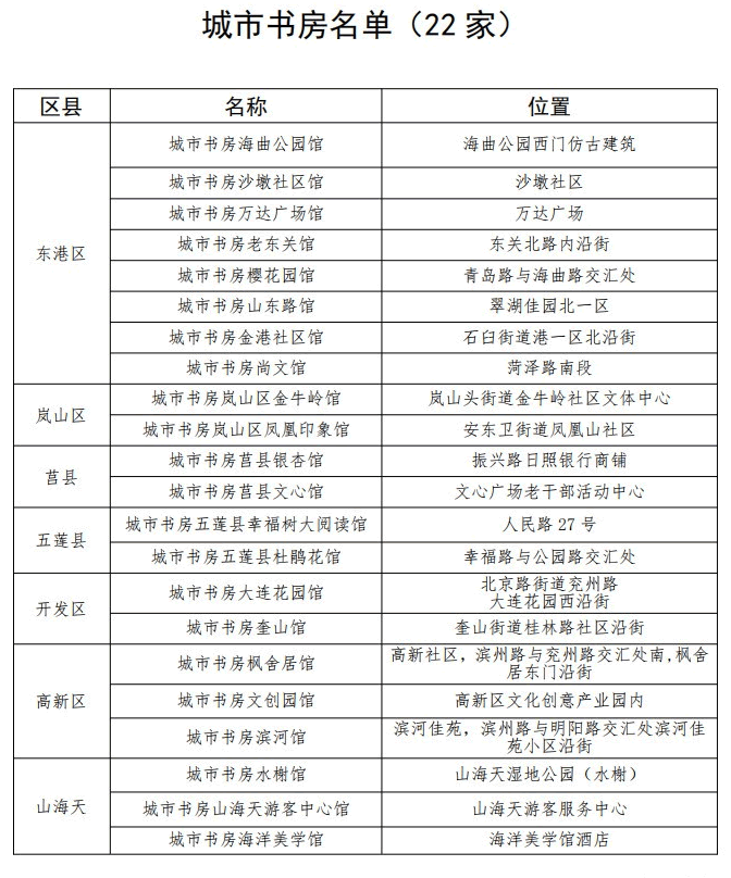 環(huán)衛(wèi)所城市書房(環(huán)翠路南段,興業(yè)新營華府西門) 運總集團城市書房(黃海二路11號) 石臼街道城市書房(黃海一路與海濱五路交匯處) 開發(fā)區(qū)中心公園城市書房(天津路72號)