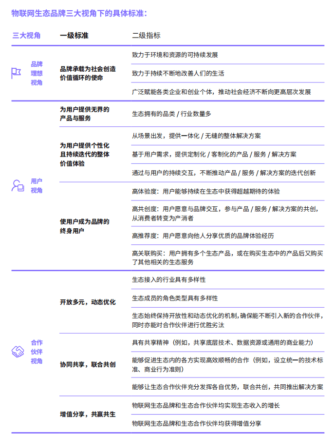 網(wǎng)絡(luò)聆聽和案頭研究,我們終明確了物聯(lián)網(wǎng)生態(tài)品牌三大視角下的具體標(biāo)準(zhǔn)/ 指標(biāo)(如后圖所示),并為每條標(biāo)準(zhǔn) / 指標(biāo)找尋到了具代表性的標(biāo)桿案例。