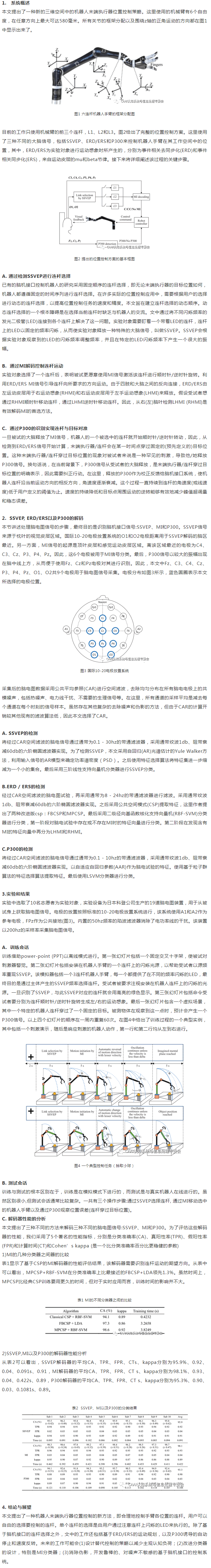 近年來,腦機接口在輔助機器人和康復工程方面的應用日益廣泛,現(xiàn)有的為位置控制應用程序設計的腦機接口存在兩個基本限制。首先,現(xiàn)有的方案大多采用開環(huán)控制,因此無法跟蹤位置誤差,導致無法采取必要的在線糾正措施。有一些基于腦電圖(EEG)的位置控制的工作雖然采取了閉環(huán)控制,但現(xiàn)這些腦誘導閉環(huán)位置控制方案采用的是固定順序的連桿選擇規(guī)則,這往往造成瓶頸,阻礙了有效的控制。其次,現(xiàn)有的腦誘導位置控制器被設計成像傳統(tǒng)的一階系統(tǒng)一樣產(chǎn)生位置響應,導致較大的穩(wěn)態(tài)誤差。文中通過穩(wěn)態(tài)視覺誘發(fā)電位(SSVEP)實現(xiàn)任意的選擇連桿以達到有效控制,并生成位置控制系統(tǒng)的二階響應,逐步減少過射/欠射,以減少穩(wěn)態(tài)誤差,從而克服了上述兩個限制。文中還提出了利用運動想象(MI)和P300信號來設計混合腦機接口系統(tǒng),通過在位置誤差的零交叉處使用速度反轉(zhuǎn)來逐漸減少誤差裕度。