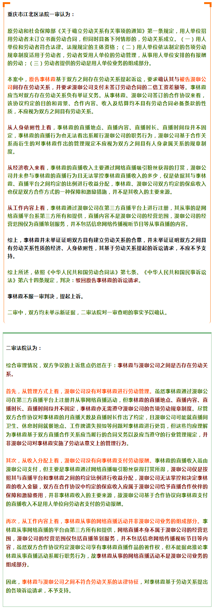 案例要旨:網(wǎng)絡(luò)主播與合作公司簽訂藝人d合作協(xié)議,通過合作公司包裝推薦,自行在第三方直播平臺(tái)上注冊(cè),從事網(wǎng)絡(luò)直播活動(dòng),并按合作協(xié)議獲取直播收入。因合作公司沒有對(duì)網(wǎng)絡(luò)主播實(shí)施具有人身隸屬性的勞動(dòng)管理行為,網(wǎng)絡(luò)主播從事的直播活動(dòng)并非合作公司的業(yè)務(wù)組成部分,其基于合作協(xié)議獲得的直播收入亦不是勞動(dòng)法意義上的具有經(jīng)濟(jì)從屬性的勞動(dòng)報(bào)酬。因此,二者不符合勞動(dòng)關(guān)系的法律特征,網(wǎng)絡(luò)主播基于勞動(dòng)關(guān)系提出的各項(xiàng)訴訟請(qǐng)求,不應(yīng)予以支持。