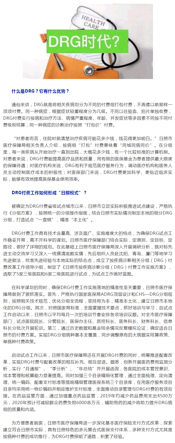 一直以來,傳統(tǒng)的“按項目付費”方式被認(rèn)為是導(dǎo)致過度醫(yī)療、大處方的重要原因之一,在浪費醫(yī)療資源的同時也加重了老百姓就醫(yī)負(fù)擔(dān),呼吁改革的聲音不斷。為健全醫(yī)保支付機(jī)制,激發(fā)醫(yī)療機(jī)構(gòu)規(guī)范行為、控制成本的內(nèi)生動力,去年5月,國家醫(yī)保局啟動按疾病診斷相關(guān)分組(DRG)付費試點,山東省在組織青島市參加國家試點的同時,首批選取10個市開展DRG付費省級試點,日照市位列其中。