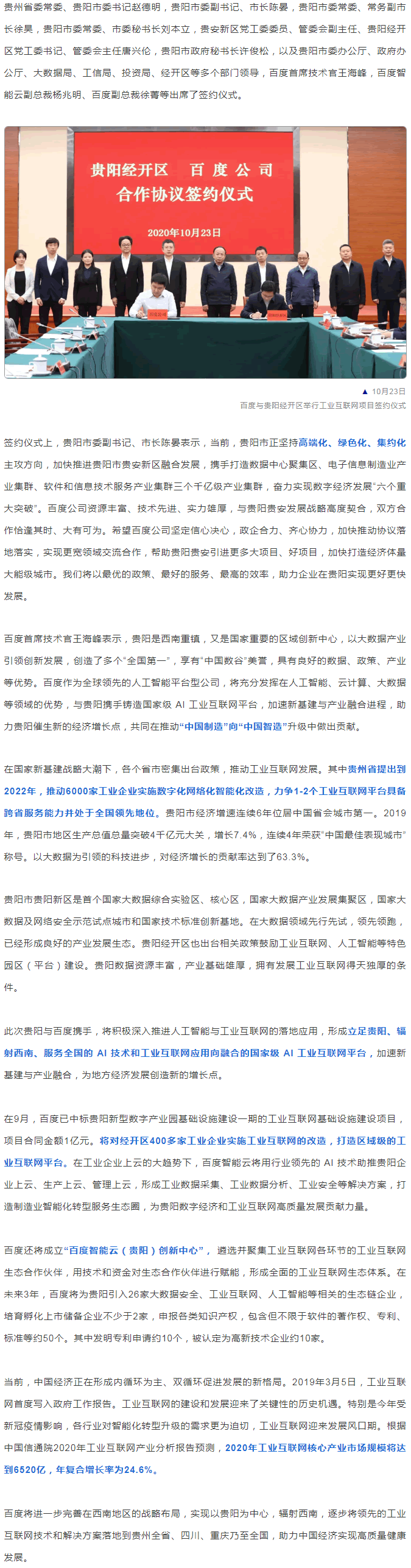 10月23日,百度與貴州省貴陽市政府正式簽署戰(zhàn)略合作協(xié)議,與貴陽經(jīng)開區(qū)舉行工業(yè)互聯(lián)網(wǎng)項(xiàng)目簽約儀式。百度將承接貴陽經(jīng)開區(qū)工業(yè)互聯(lián)網(wǎng)項(xiàng)目建設(shè),打造 AI 技術(shù)和工業(yè)互聯(lián)網(wǎng)應(yīng)用相融合的 AI 工業(yè)互聯(lián)網(wǎng)平臺,形成多面的工業(yè)互聯(lián)網(wǎng)生態(tài)體系,助力貴陽打造3個千億級產(chǎn)業(yè)集群,形成新的經(jīng)濟(jì)增長點(diǎn)。
