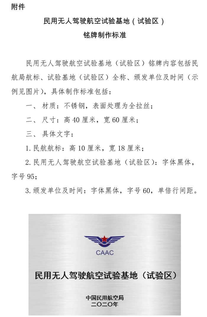 請首批民用無人駕駛航空試驗基地(試驗區(qū))所屬地方政府結(jié)合本地實(shí)際,按照各自目標(biāo)定位,進(jìn)一步加強(qiáng)工作推進(jìn),完善運(yùn)行管理機(jī)制,落實(shí)重點(diǎn)任務(wù),做好試驗基地(試驗區(qū))建設(shè)和運(yùn)行相關(guān)工作,試出成效、確保安全;并按照統(tǒng)一標(biāo)準(zhǔn)自行制作試驗基地(試驗區(qū))銘牌(標(biāo)準(zhǔn)見附件2) 。