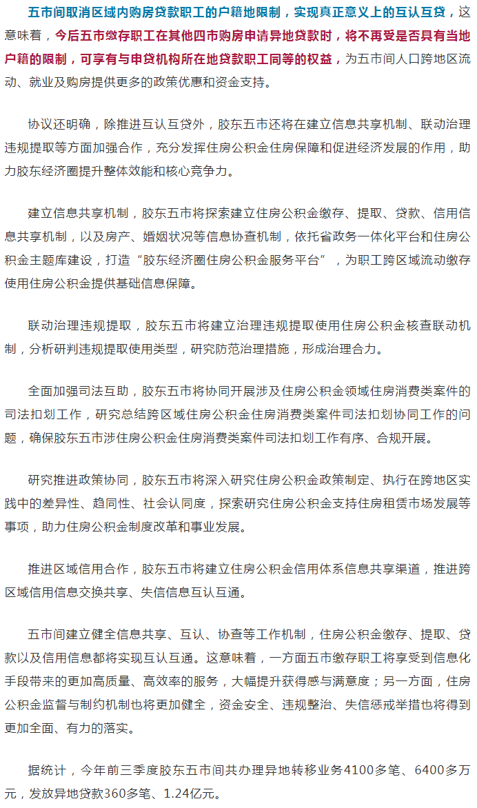 根據(jù)協(xié)議,膠東五市住房公積金部門將深入推進(jìn)互認(rèn)互貸,推動(dòng)住房公積金轉(zhuǎn)移接續(xù)和繳存信息互認(rèn),在尊重五市具體政策措施的基礎(chǔ)上,取消區(qū)域內(nèi)購(gòu)房貸款職工戶籍地限制,確保申請(qǐng)異地貸款的職工與申貸機(jī)構(gòu)所在地貸款職工享有同等權(quán)益。