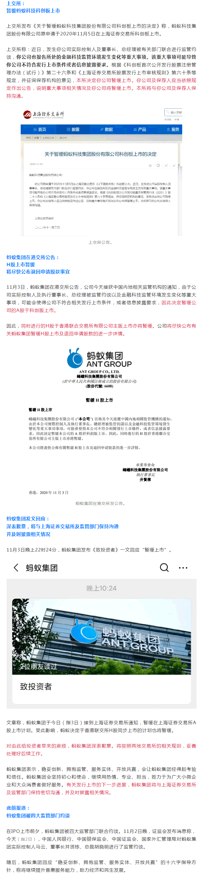 港交所也發(fā)布公告稱,暫緩螞蟻集團H股上市,并表示將盡快公布有關(guān)螞蟻集團暫緩H股上市及退回申請股款的進一步詳情
