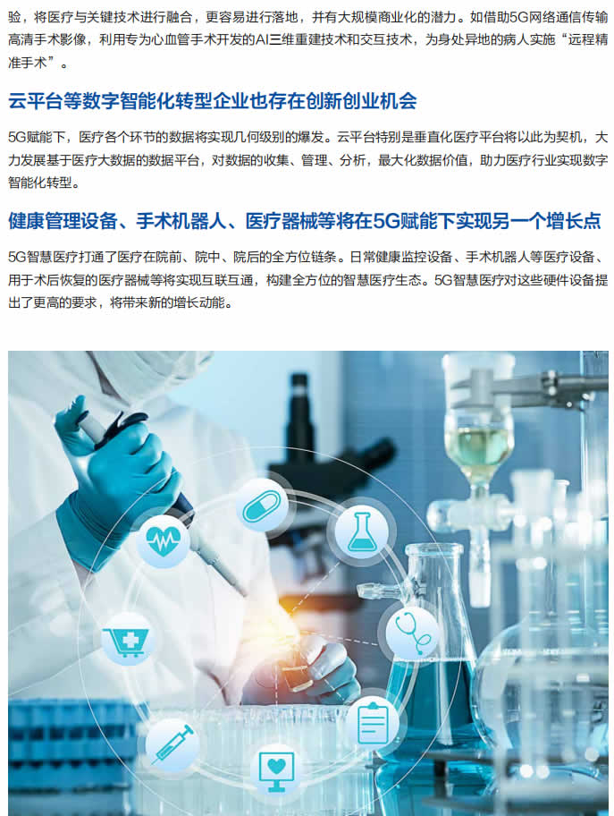 “5G+醫(yī)療健康”將實(shí)現(xiàn)醫(yī)生從在醫(yī)院到在云端,醫(yī)療設(shè)備從醫(yī)院內(nèi)到隨身攜帶,從院內(nèi)全連接到少量設(shè)備 遠(yuǎn)程化,再到設(shè)備普遍遠(yuǎn)程化。便攜式、無(wú)線化醫(yī)療設(shè)備資源逐步從大型醫(yī)療機(jī)構(gòu)走近基層醫(yī)療機(jī)構(gòu)和個(gè)人家 庭;大型醫(yī)院院內(nèi)醫(yī)療服務(wù)走向無(wú)線化和智能化;實(shí)體大型醫(yī)院從支持院間遠(yuǎn)程醫(yī)療發(fā)展成為面向醫(yī)聯(lián)體、社 區(qū)、家庭的醫(yī)療服務(wù)網(wǎng);互聯(lián)網(wǎng)醫(yī)院實(shí)現(xiàn)線上線下對(duì)接;實(shí)體大醫(yī)院主導(dǎo)的遠(yuǎn)程醫(yī)療和OTT主導(dǎo)的互聯(lián)網(wǎng)醫(yī) 療逐步走向融合的新醫(yī)療。