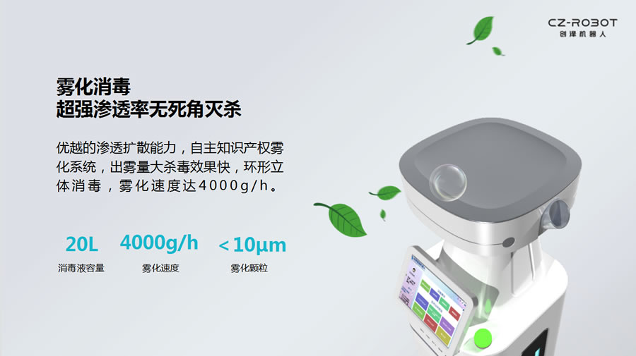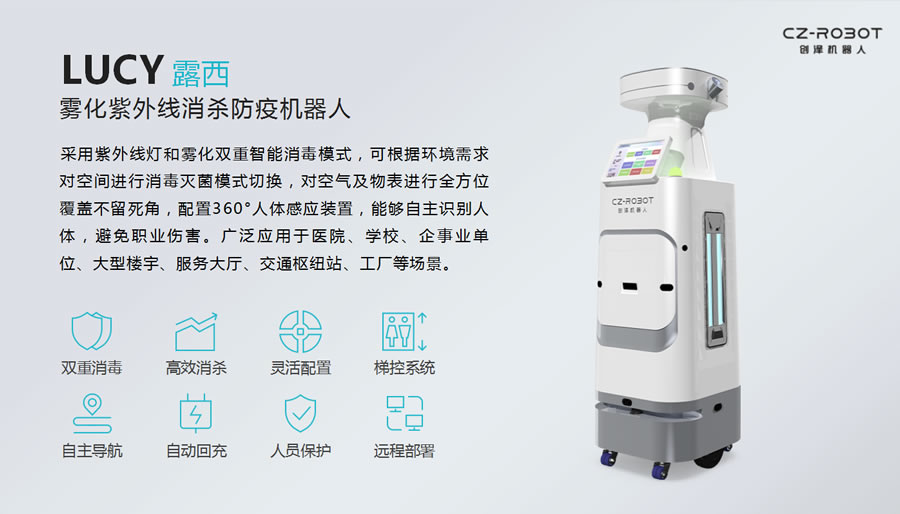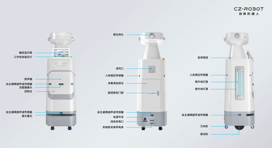 創(chuàng)澤消毒機器人擁有自主導(dǎo)航技術(shù),能夠根據(jù)設(shè)定的路線自主移動,滿足房間多或者布局復(fù)制的室內(nèi)環(huán)境下自動、定時、準確的消毒需求。可實現(xiàn)等離子消毒、紫外線消毒、地面消毒等多模式智能消毒,配有“人機共存”和“無人消毒”兩種消毒模式,使消毒更具人性化。