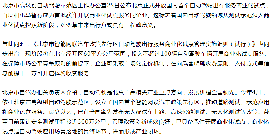 據(jù)了解,此次管理政策,從申請審核、試點管理、網(wǎng)絡(luò)數(shù)據(jù)安全、服務(wù)監(jiān)督與違規(guī)管理等方面對企業(yè)開展商業(yè)化出行服務(wù)進行全方位詳細規(guī)范。在市場層面,鼓勵和引導自動駕駛出行服務(wù)商業(yè)模式探索和創(chuàng)新,并統(tǒng)籌技術(shù)更新迭代和產(chǎn)業(yè)發(fā)展;在網(wǎng)絡(luò)數(shù)據(jù)安全層面,明確在商業(yè)化試點中采集的數(shù)據(jù)未經(jīng)批準不得出境,同時要求企業(yè)進行網(wǎng)絡(luò)安全管理;在申請審核方面,從事前、事中、事后三維度對申請主體、車、人、平臺等對象的合規(guī)性做出了詳盡要求;在服務(wù)監(jiān)督和違規(guī)管理方面,構(gòu)建新型的服務(wù)、客訴和定價等管理機制保障市場化公平競爭。