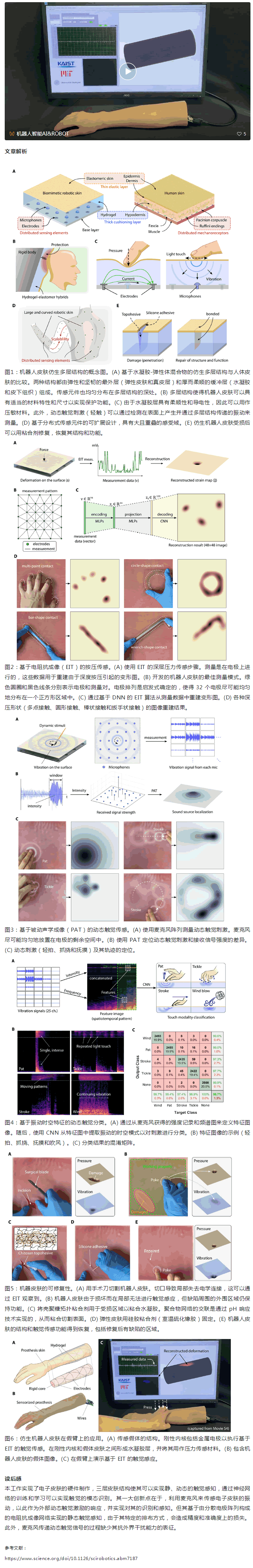 韓國(guó)科學(xué)技術(shù)院的J. Kim課題組提出了一種基于水凝膠彈性體混合物的仿生機(jī)器皮膚,可以同時(shí)實(shí)現(xiàn)靜態(tài)(按壓)、動(dòng)態(tài)(表面振動(dòng)、滑動(dòng)等)觸覺的識(shí)別。皮膚分為三層結(jié)構(gòu),表面的一層起保護(hù)作用,中間的水凝膠層構(gòu)成機(jī)器皮膚的主體,由于其具有導(dǎo)電性,因此可以實(shí)現(xiàn)電信號(hào)的傳遞。水凝膠層和底層之間分布著電J和麥克風(fēng)陣列,由于水凝膠層的可形變性,其對(duì)壓力可以產(chǎn)生阻抗變化的響應(yīng),電J陣列通過(guò)電阻抗成像技術(shù)可以實(shí)現(xiàn)按壓壓力的識(shí)別;當(dāng)皮膚表面有振動(dòng)、摩擦的激勵(lì)時(shí),振動(dòng)通過(guò)水凝膠傳遞至麥克風(fēng),便可以產(chǎn)生相應(yīng)的電信號(hào)響應(yīng)。通過(guò)神經(jīng)網(wǎng)絡(luò)的訓(xùn)練和學(xué)習(xí),可以實(shí)現(xiàn)靜態(tài)和動(dòng)態(tài)觸覺的模態(tài)識(shí)別。