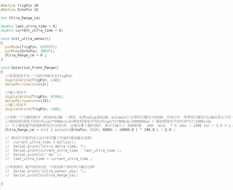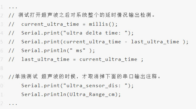 該程序定義了一個存儲測距信息的變量 Ultra_Range_cm , 測距范圍為“0-1m”。此時,我們可以看見下面有兩大段注釋。其中,D一段是用來測試整個系統(tǒng)功能執(zhí)行一遍所需要的時間,若取消掉注釋,即可在 串口監(jiān)視器 實時查看輸出的時間信息。