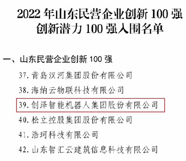 創(chuàng)澤機(jī)器人入圍2022年山東民營企業(yè)100強(qiáng)名單【喜訊】 |